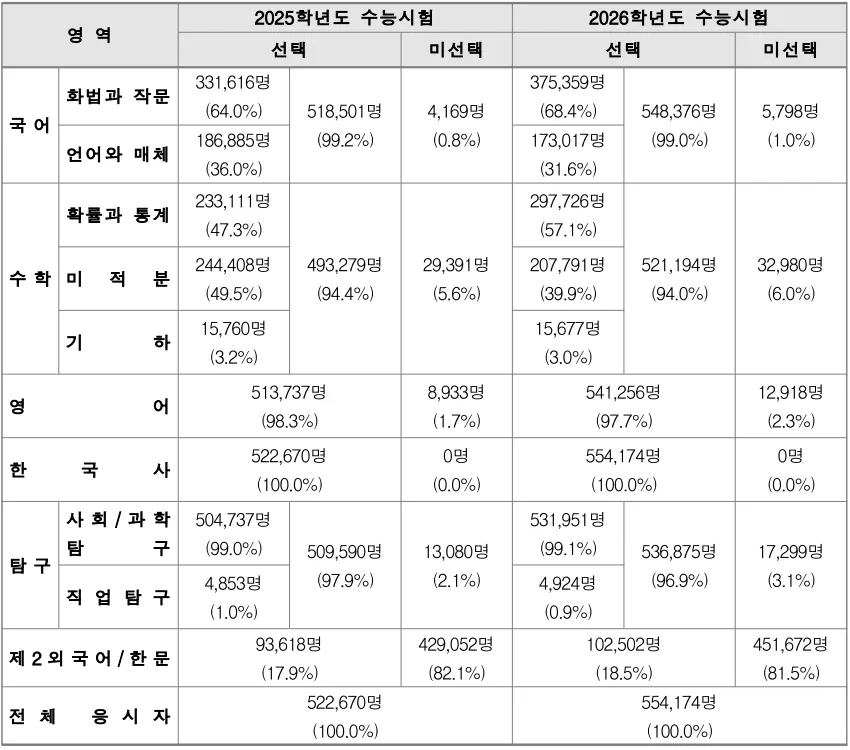 2026학년도 수능시험에서 국어ㆍ수학 영역의 선택 과목별 응시자 수를 살펴보면, 국어 영역은 전체 국어 영역 응시자 중 68.4%에 해당하는 375,359명이 ‘화법과 작문’을 선택했고, 나머지 31.6%에 해당하는 173,017명이 ‘언어와 매체’를 선택했다. 2025학년도 수능시험에서는 전체 국어 영역 응시자 중 64.0%에 해당하는 331,616명이 ‘화법과 작문’을 선택했고, 나머지 36.0%에 해당하는 186,885명이 ‘언어와 매체’를 선택했었다.