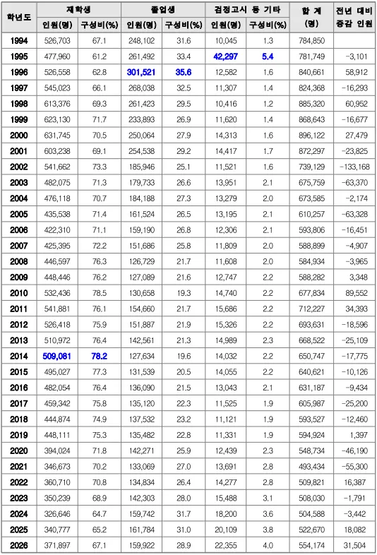 또한 검정고시 출신자 등 기타 응시자가 22,355명으로 2025학년도에 20,109명이었던 것보다도 2,246명이 증가한 것도 변화로 들 수 있다. 이들 응시자가 증가는 고등학교 1, 2학년 학생부 교과 성적이 낮은 학생들이 자퇴를 한 다음 고등학교 졸업학력 검정고시에 합격하고 수능시험 위주로 대학입시를 준비하는 수험생이 그만큼 증가했다는 것이 된다.