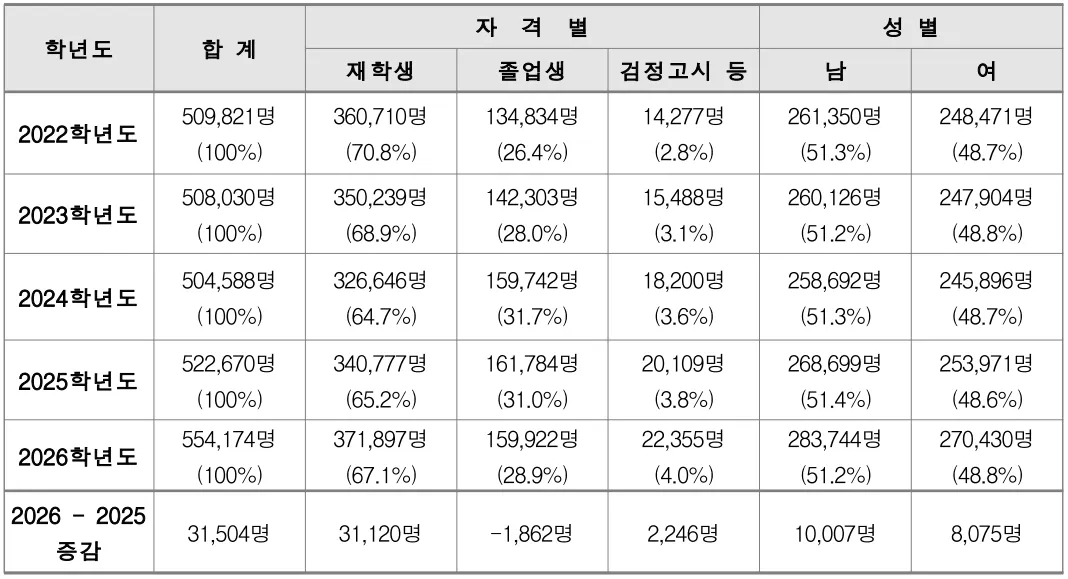 11월 13일에 실시하는 2026학년도 수능시험에 응시하게 될 수험생이 554,174명으로 집계되었다. 이는 8월 21일부터 9월 5일까지 전국 85개 시험지구 교육청과 고등학교에서 수능시험 응시원서를 접수한 결과에 따른 것으로 2025학년도에 522,670명이 응시했던 것보다 31,504명이 증가한 것이 되고, 2024학년도에 504,588명이 응시했던 것보다도 49,586명이 증가한 것이된다.